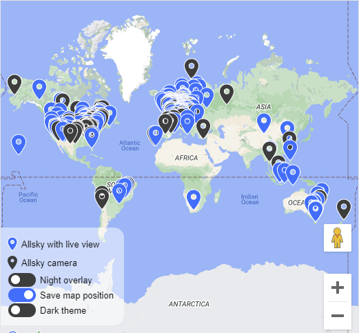 The Allsky Map shows the location and basic information of all known allsky cameras. Clicking on a pin displays information about the camera and if the owner has set their image URL, you'll see their last image as well; clicking on the image takes you to their Allsky website.