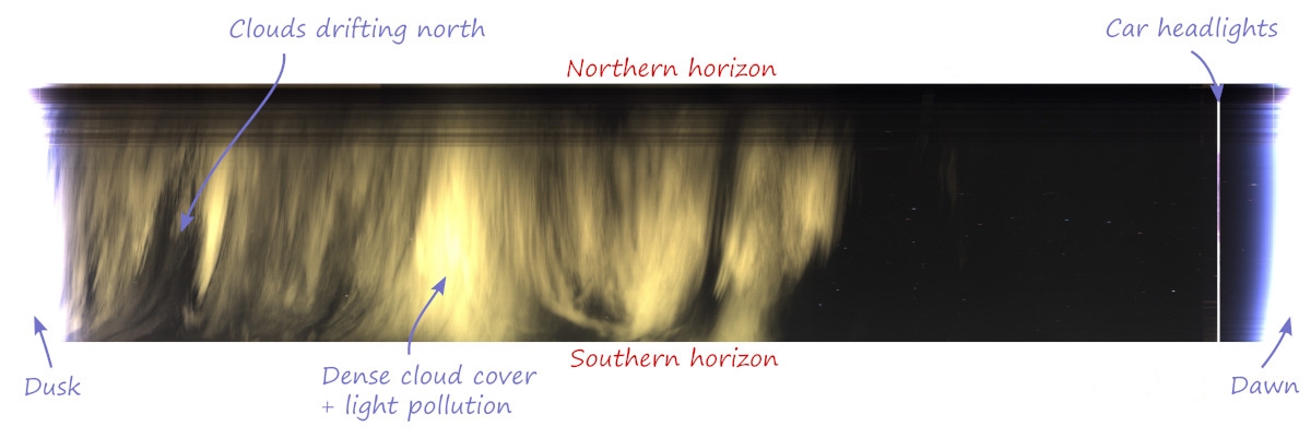 The result is an image where one axis represents time and the other axis represents position in the sky. This makes keograms particularly useful for showing how sky brightness, cloud cover, twilight, aurora, airglow, or other large-scale atmospheric features change over time.
