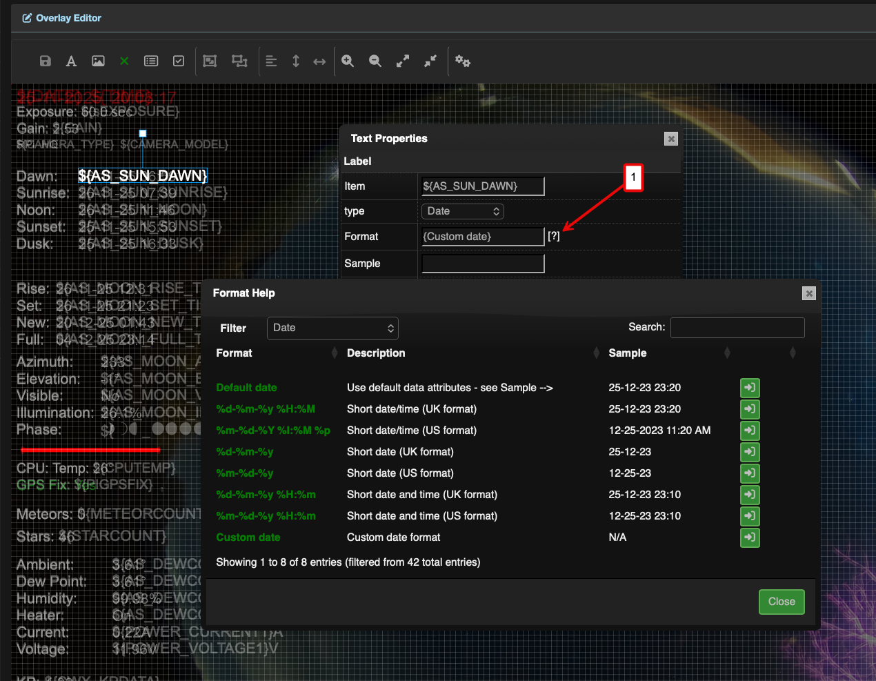 Each variable within Allsky has a default format but you can override this. To overide a variables format double click on the field containing the variable then click on the ? button at the end of the format field