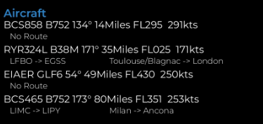 For each aircraft the following data is available for use in overlays, (X) in the table below relates to the aircraft number. The aircraft are sorted with the first being the closest to your location