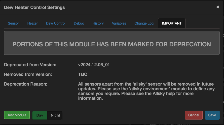 Some modules are shown as experimental. Before using these modules you should ensure that you are proficient in analysing Linux log files. Experimental modules can be unstable and as such may "break" Allsky.