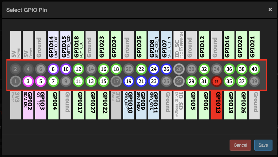 This field will allow the user to select a gpio pin using a graphical interface. The user simple needs to click on the pin they require.