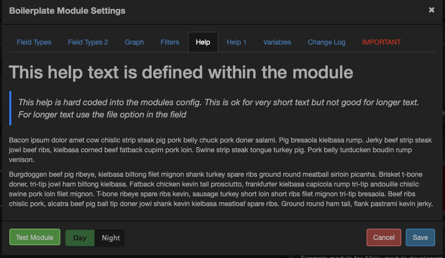 "html": "<h1>This help text is defined within the module</h1><blockquote>This help is hard coded into the modules config. This is ok for very short text but not good for longer text. For longer text use the file option in the field</blockquote><p>Bacon ipsum dolor amet cow …<p>",