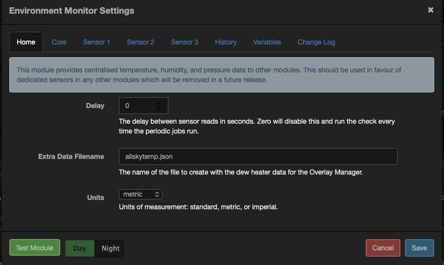 "message": "This module provides centralised temperature, humidity, and pressure data to other modules. This should be used in favour of dedicated sensors in any other modules which will be removed in a future release.",