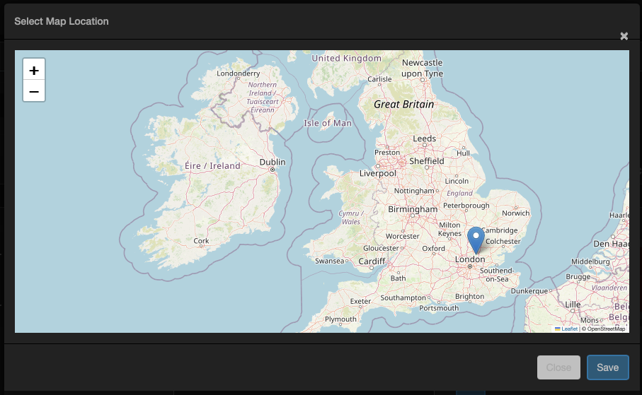 This field allows the user to select a position from a map. There are three additional parameters required for this field, all refer to the name of the value in the arguments section