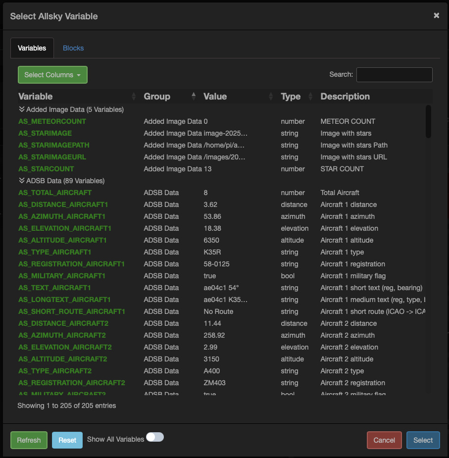 If you need the user to select another variable from within Allsky then this field type will display the variable manager allowing a variable to be selected. The ‘selectmode’ option has to options ‘single’ or ‘multi’. This controls if the user can select a single variable or multiple. Multiple variables will be presented as a comma separated list.